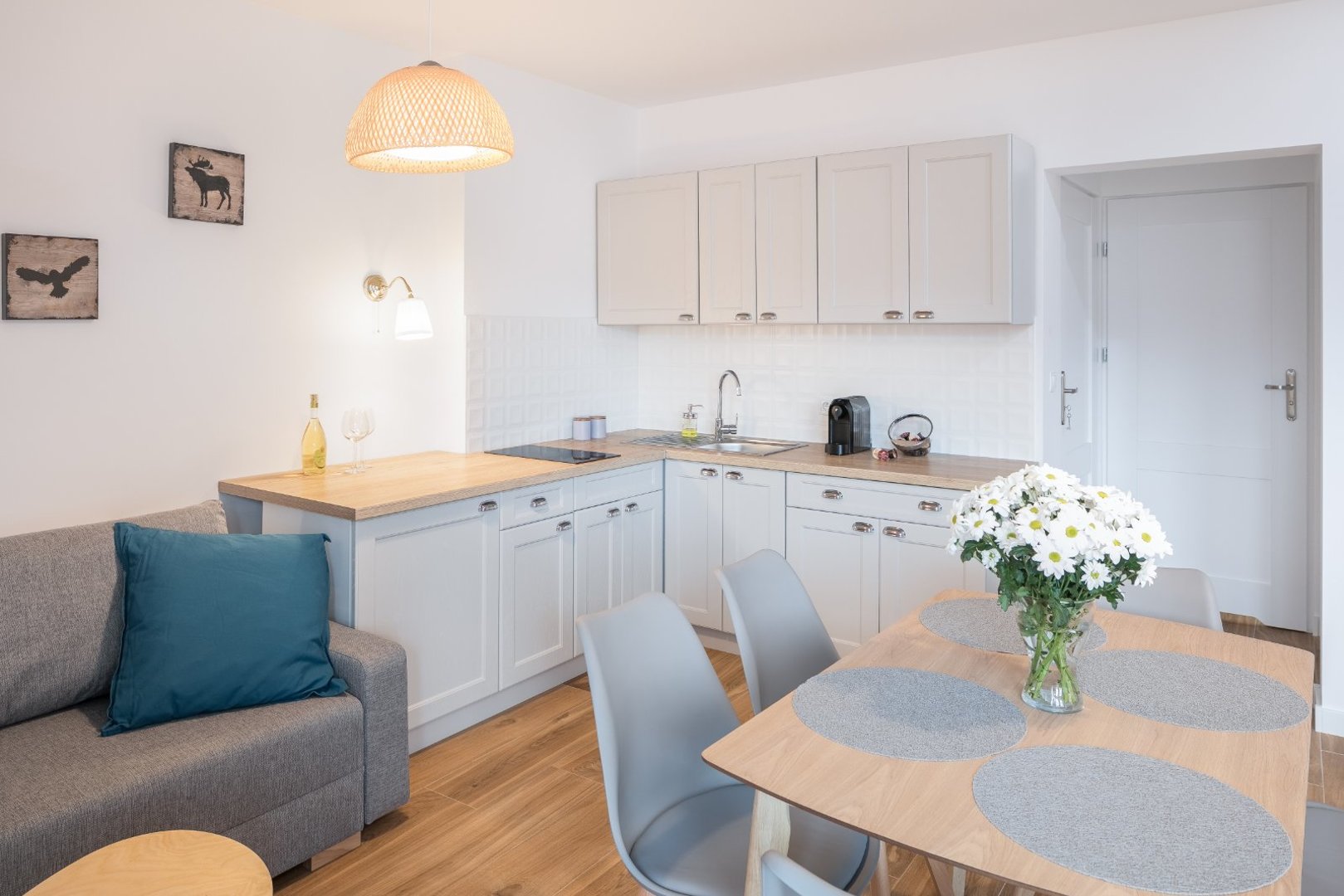 W aneksie kuchennym znajdą Państwo niezbędne urządzenia do samodzielnego przygotowywania posiłków, takie jak płyta indukcyjna, kuchenna mikrofalowa, ekspres do kawy z zapasem kasułek czy czajnik. Nie zabraknie także sztućców, talerzy szklanek czy garnków.